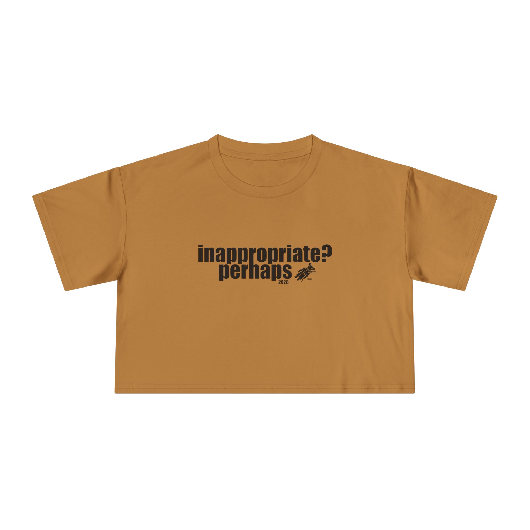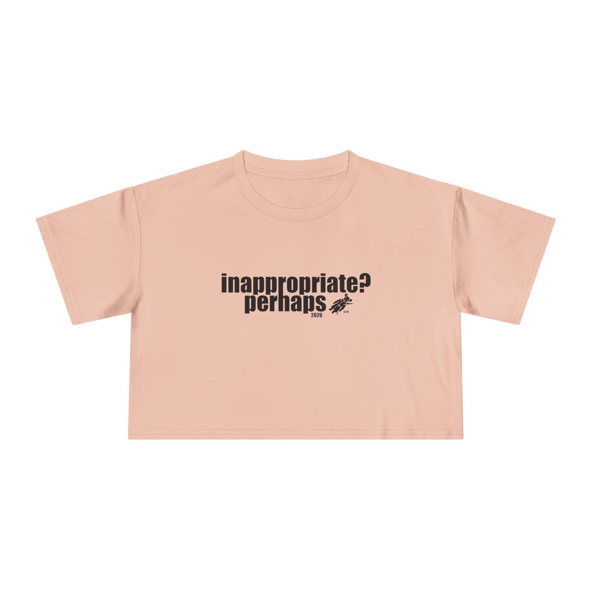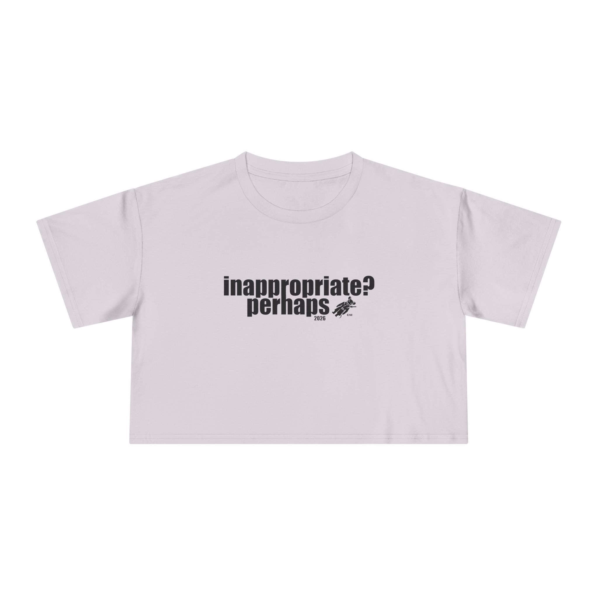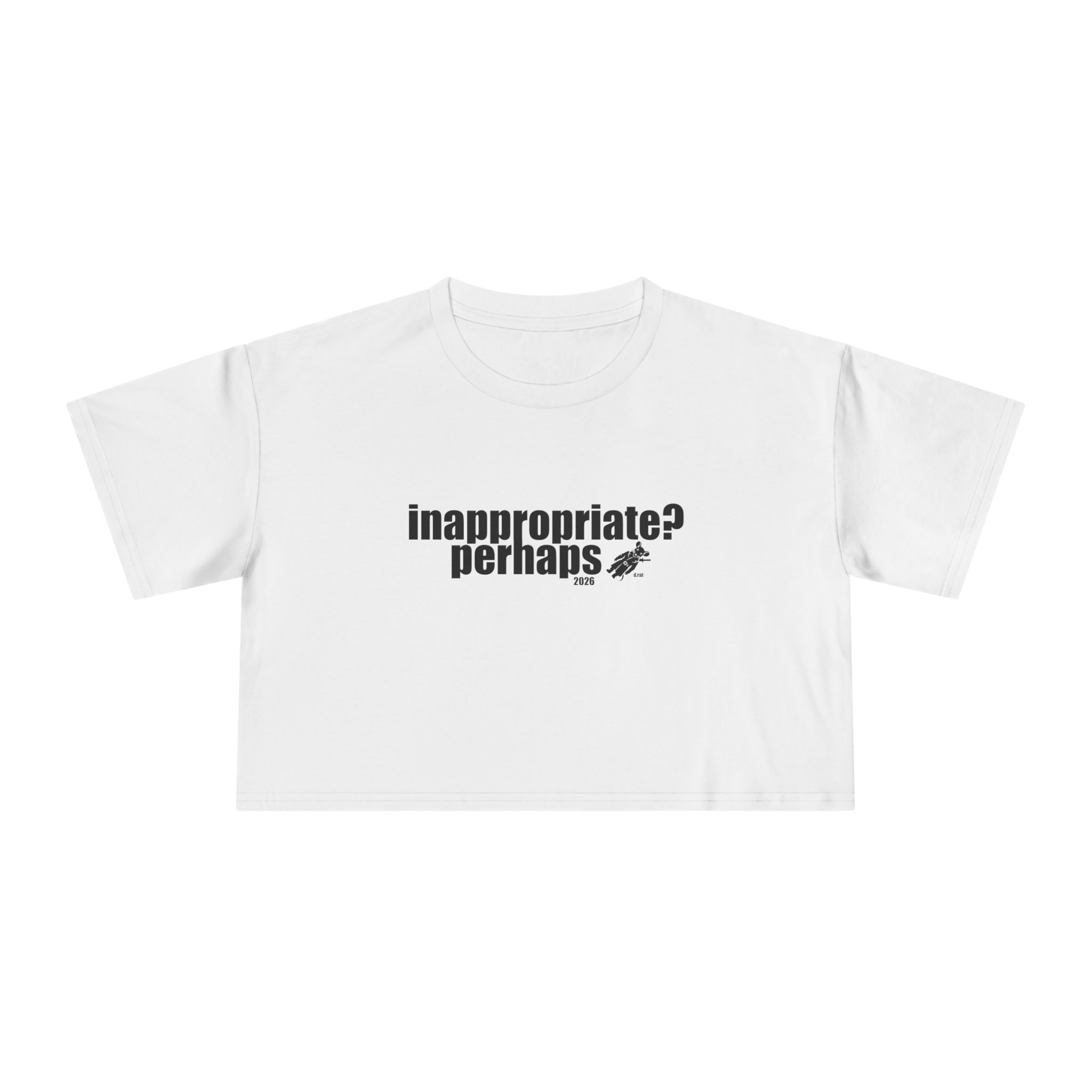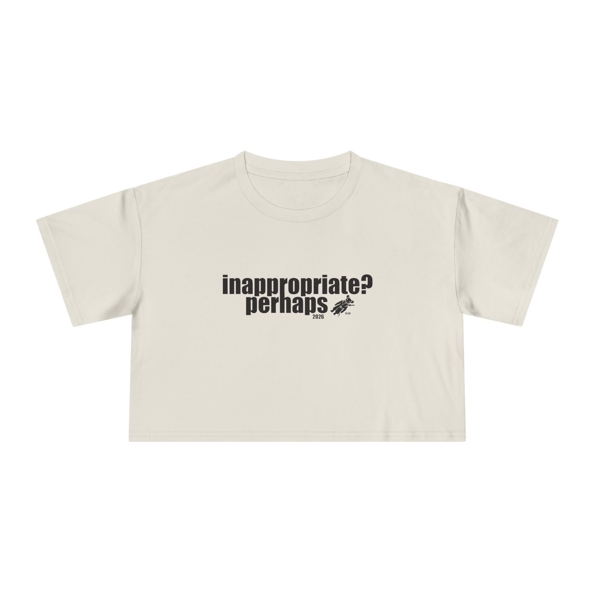 A relaxed crop tee that speaks in soft sarcasm. The front bears a small, cheeky block-print reading “inappropriate? perhaps.” while the back flashes a playful, hand-drawn logo in bright colors. The short, dropped shoulders and boxy silhouette sit just above the waist, making it easy to layer over high-waist jeans or let it breathe with a slipped-on button-down. The midweight cotton feels familiar and broken-in from the first wear. Wear it to coffee runs, late-night art shows, small rebellions, and quick city strolls — it’s the sort of top that starts conversations without trying too hard.