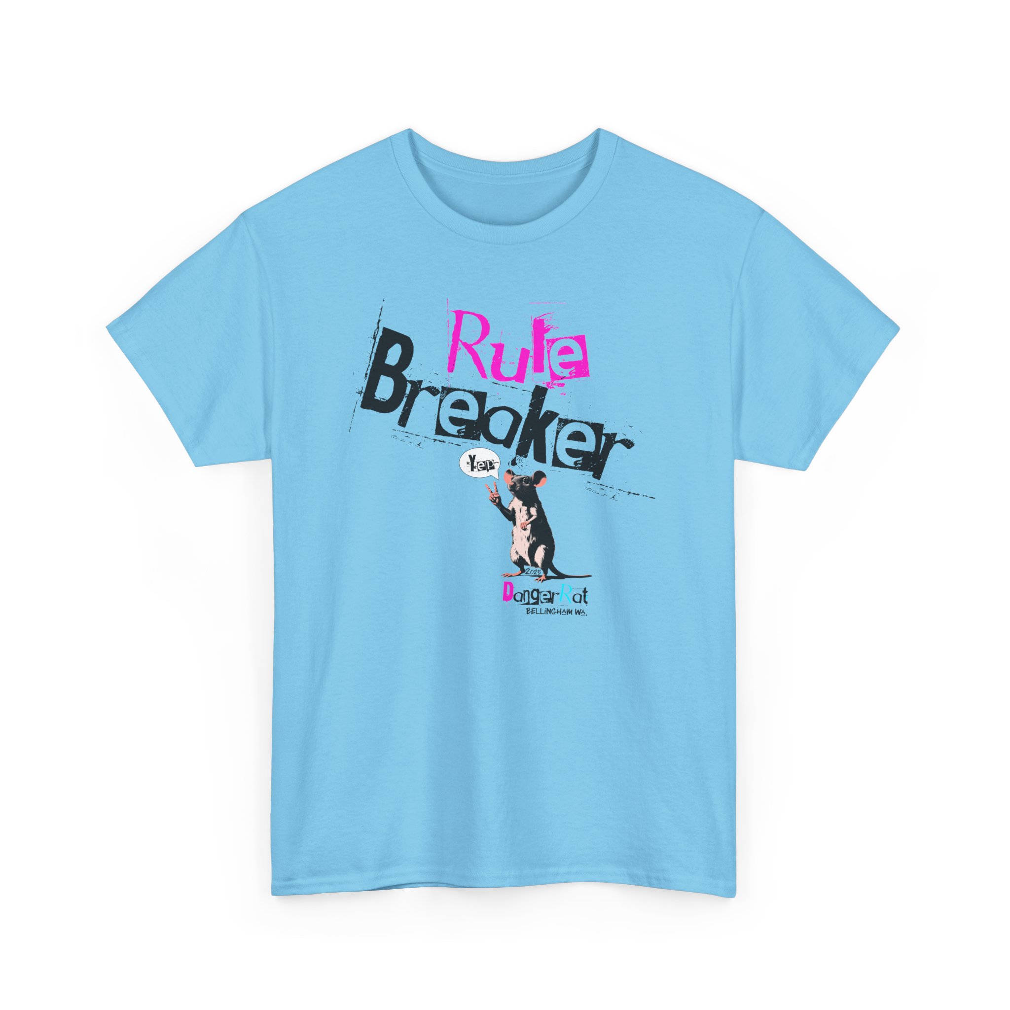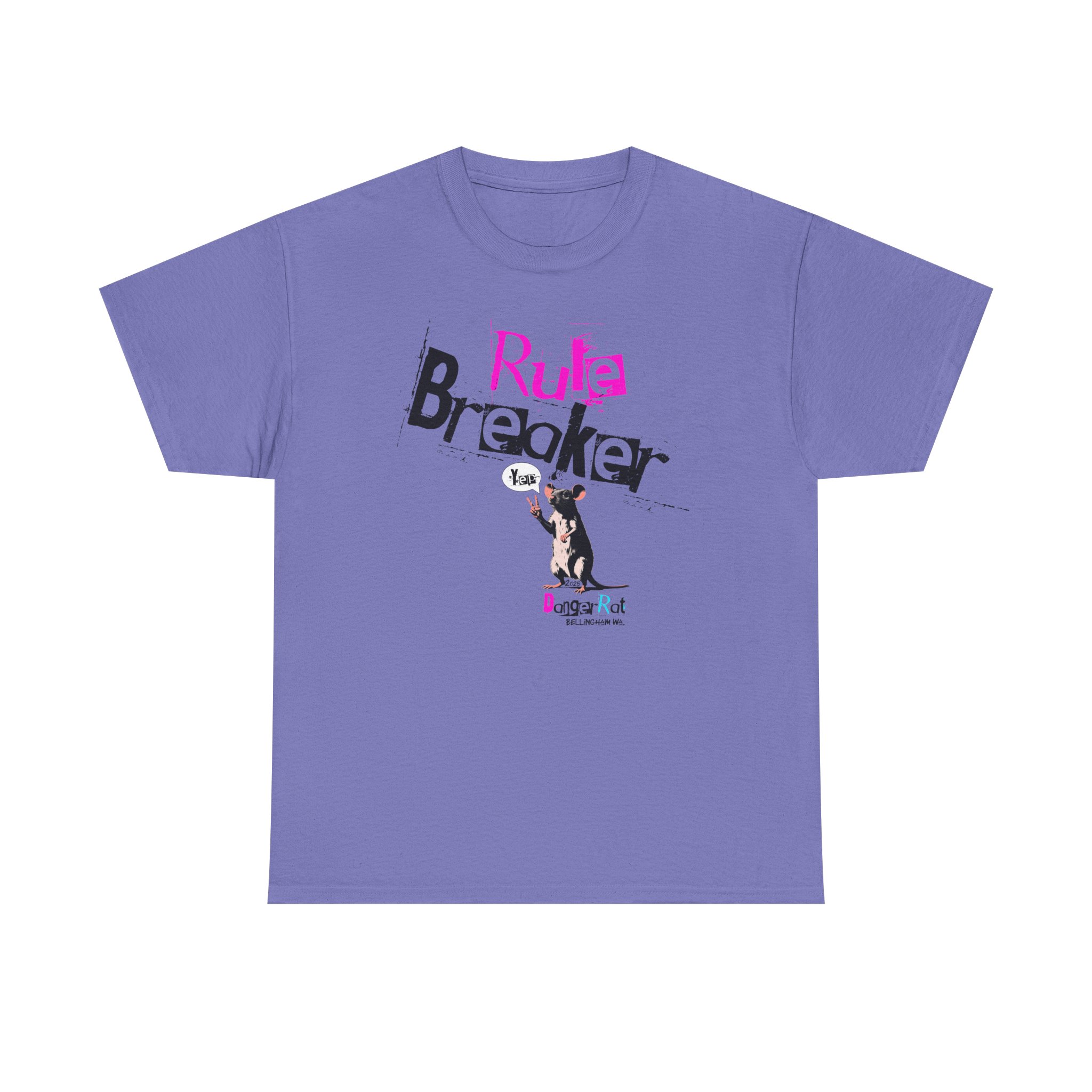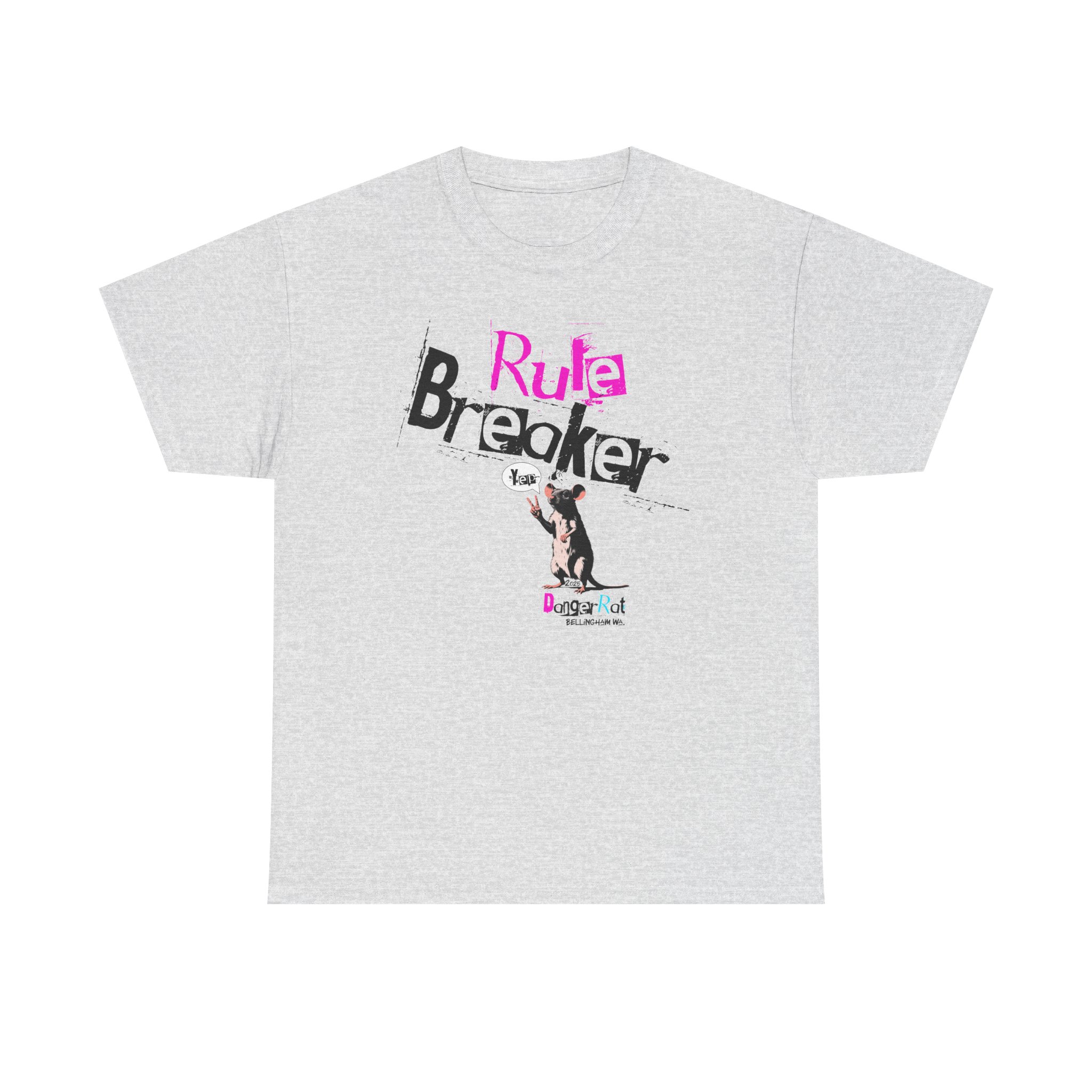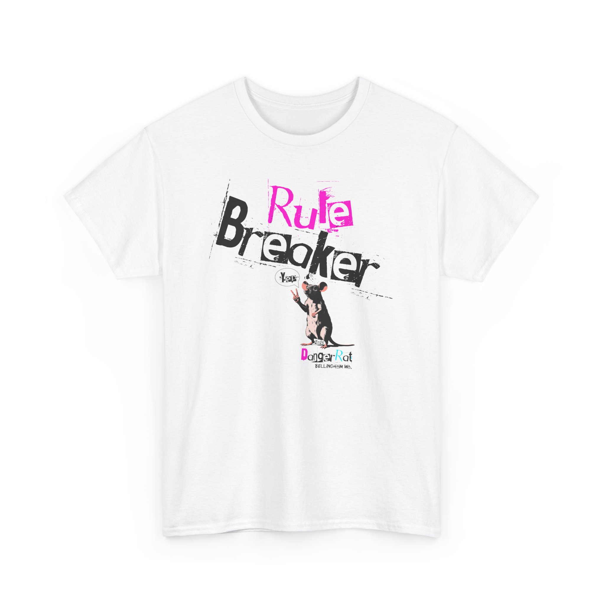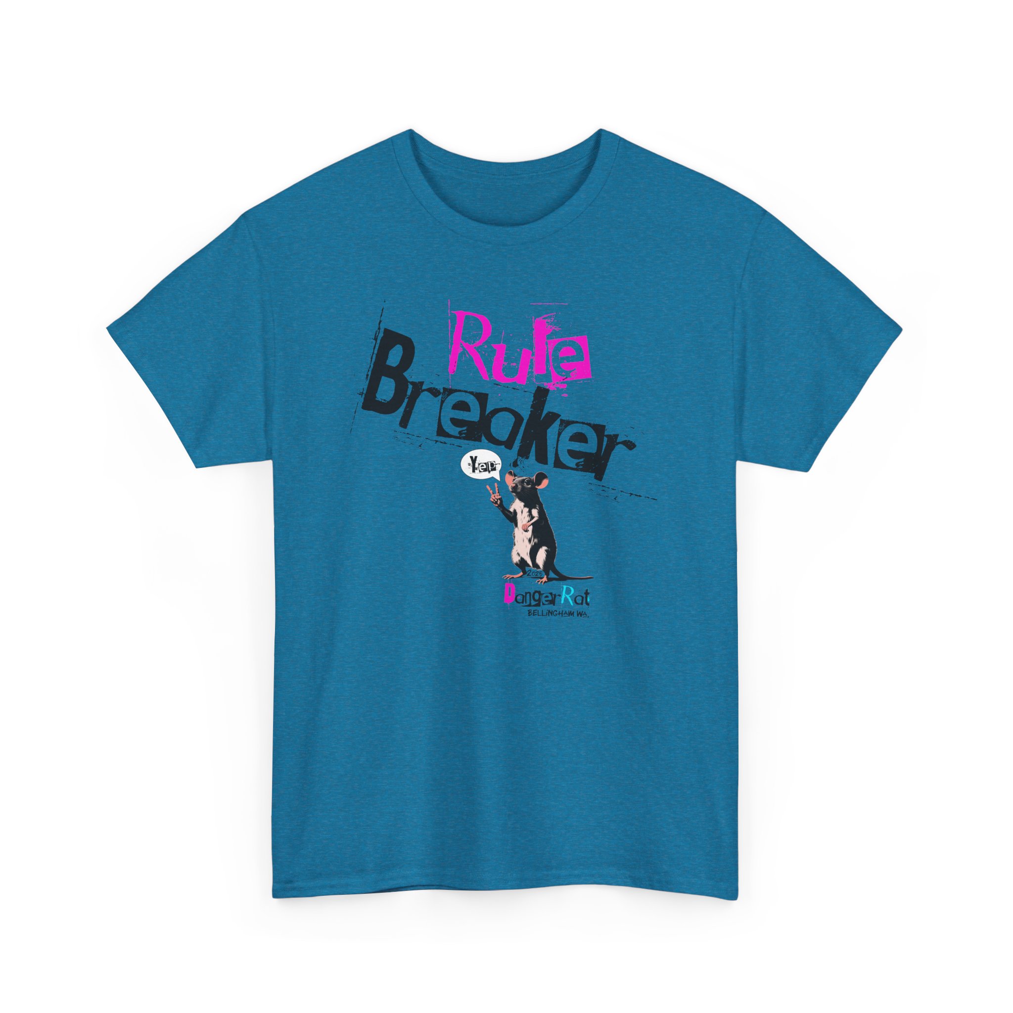 This soft, mid-weight tee carries a playful, rebellious vibe. A distressed, mixed-font front graphic reads “Rule Breaker” above a small illustrated rat—bold, a little cheeky, and unapologetic. The back features a colorful oval logo that nods to underground zines and DIY show flyers. Wear it to show a streak of humor and defiance, whether you’re wandering city alleys, stacking records at a flea market, or meeting friends at a low-key gig. The relaxed crew fit and smooth cotton surface keep the focus on the art while staying comfortable all day.