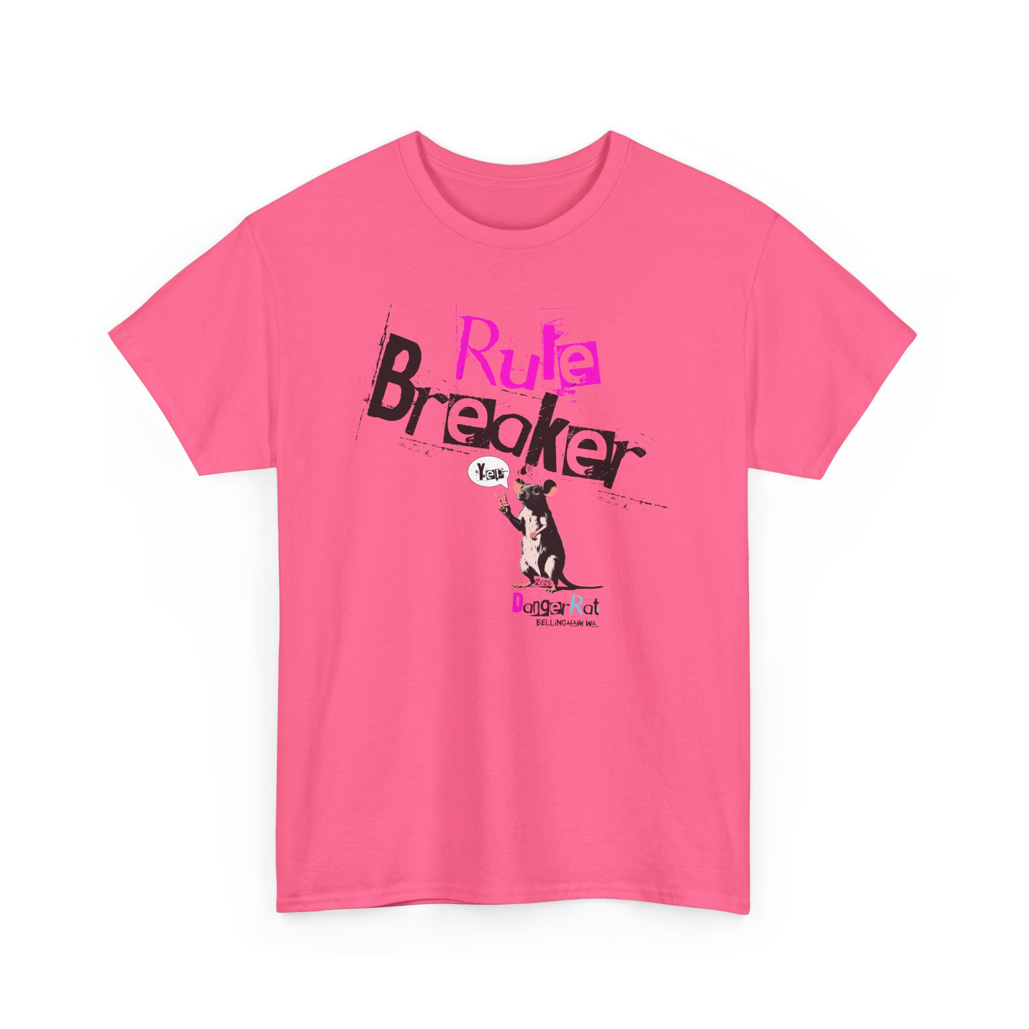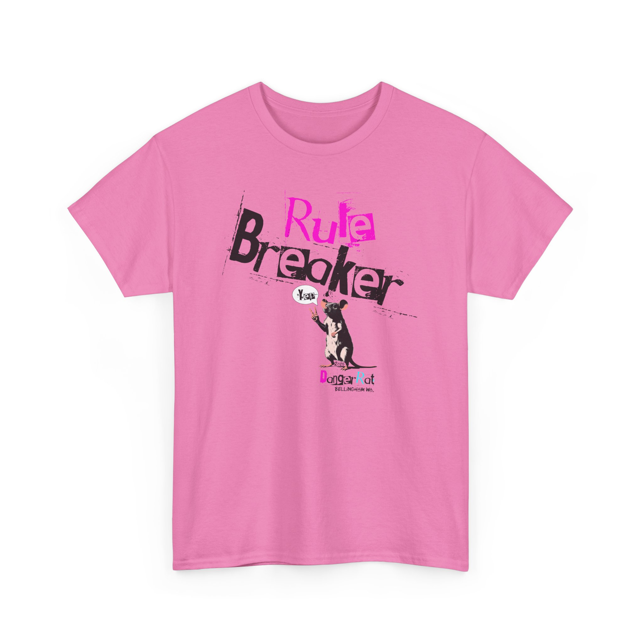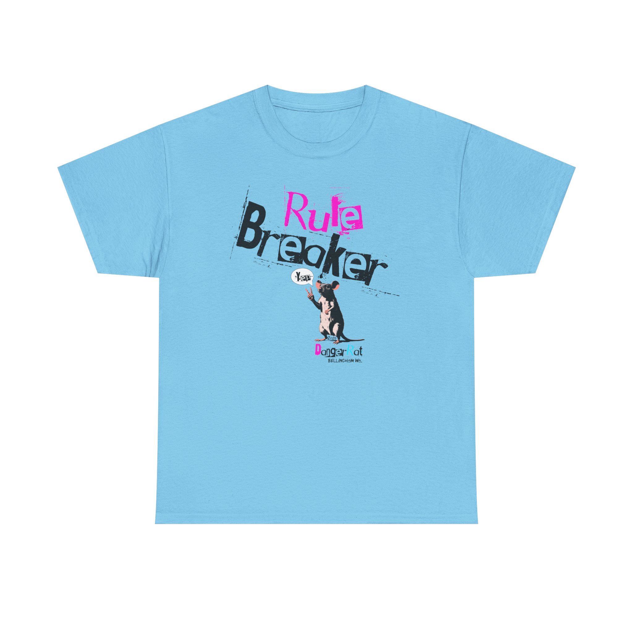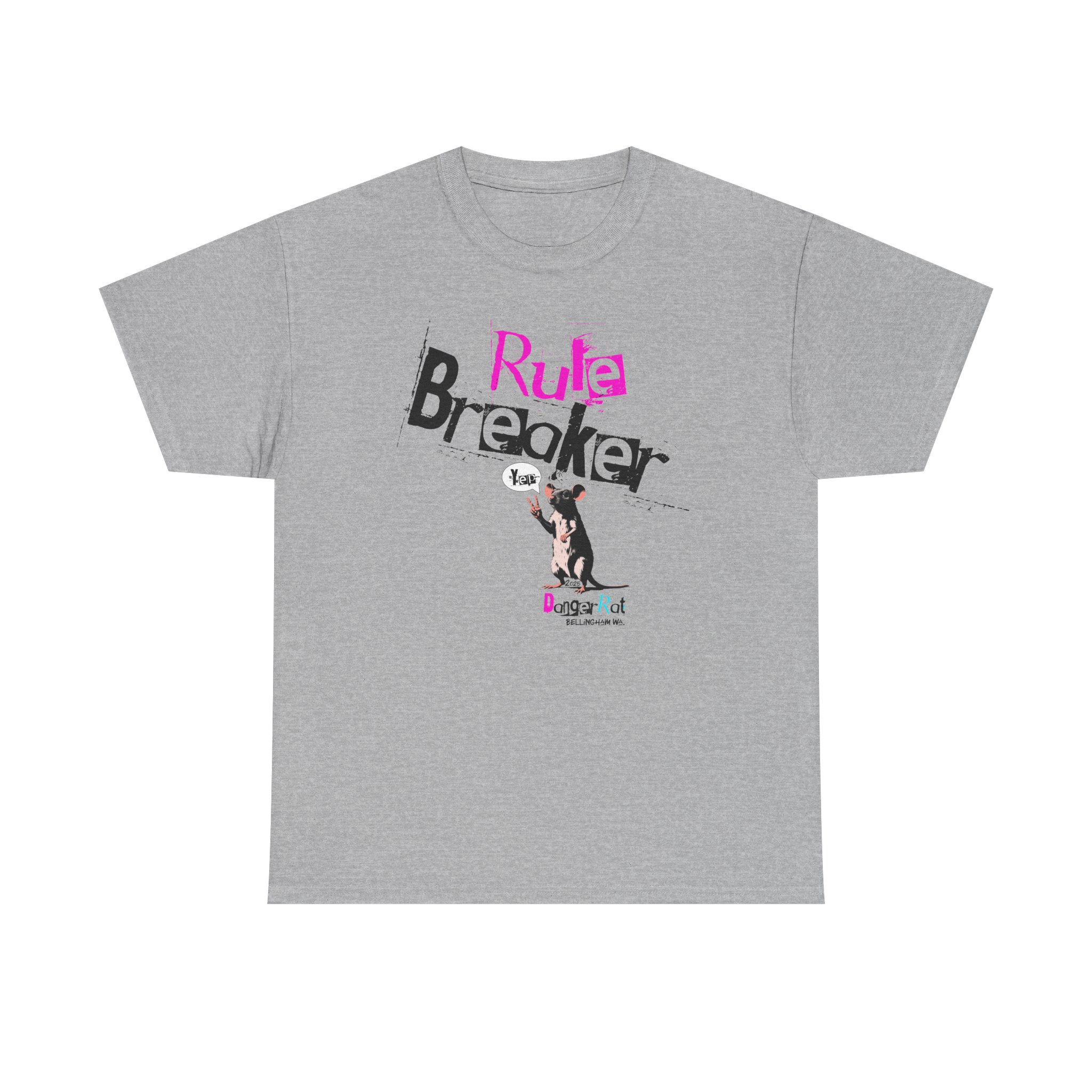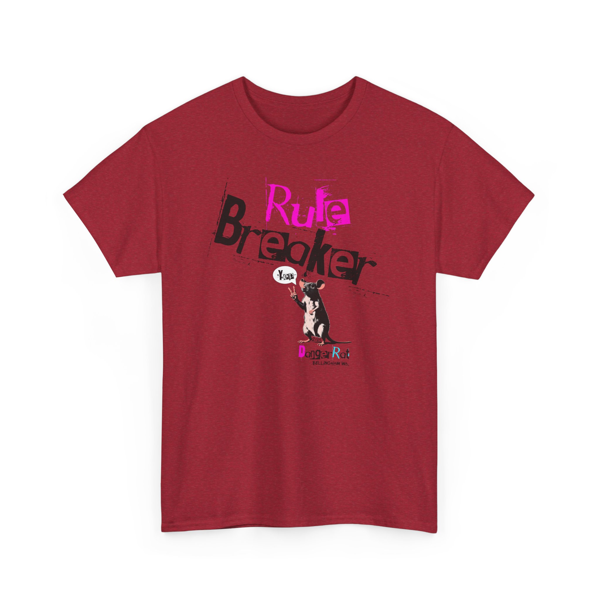 This soft, mid-weight tee carries a playful, rebellious vibe. A distressed, mixed-font front graphic reads “Rule Breaker” above a small illustrated rat—bold, a little cheeky, and unapologetic. The back features a colorful oval logo that nods to underground zines and DIY show flyers. Wear it to show a streak of humor and defiance, whether you’re wandering city alleys, stacking records at a flea market, or meeting friends at a low-key gig. The relaxed crew fit and smooth cotton surface keep the focus on the art while staying comfortable all day.