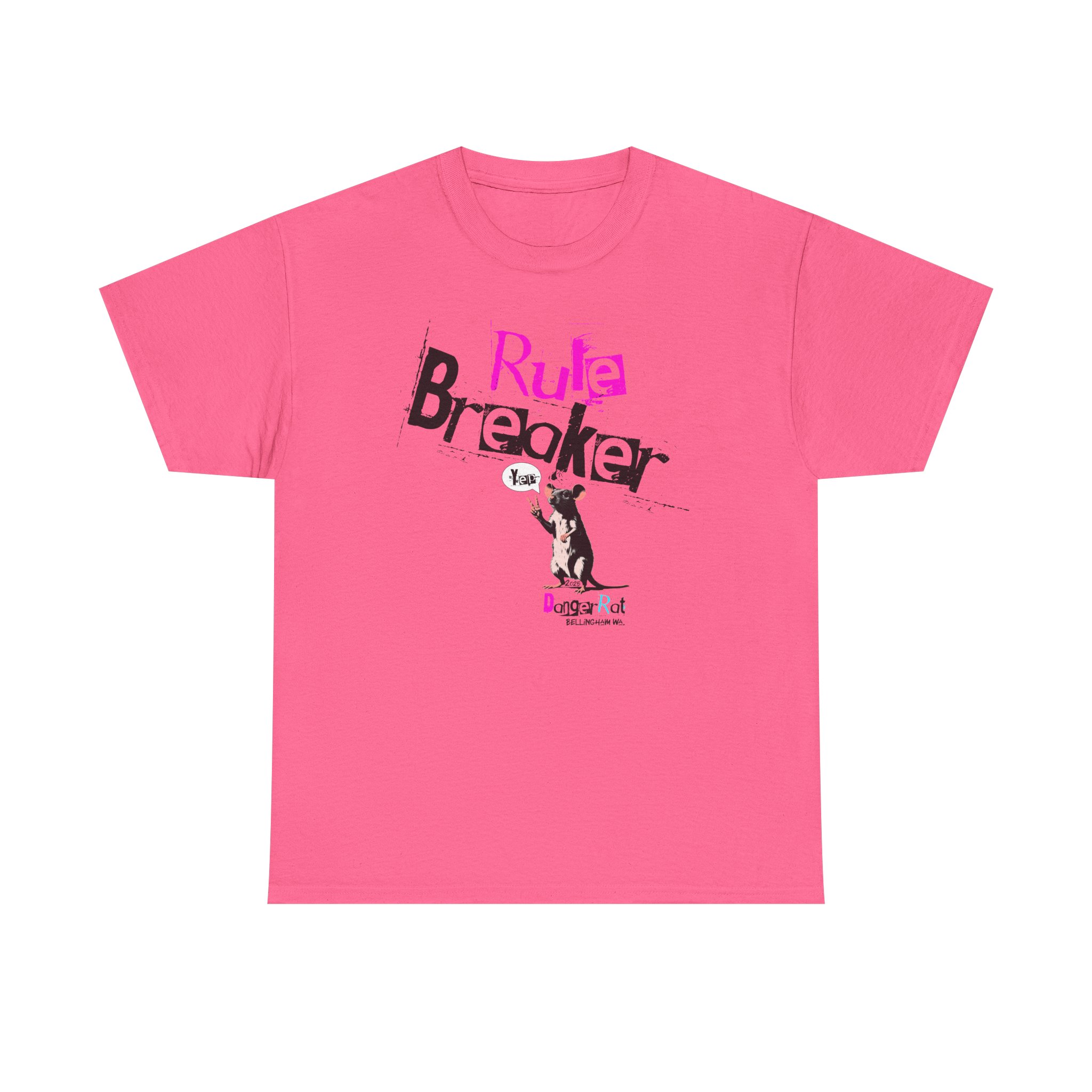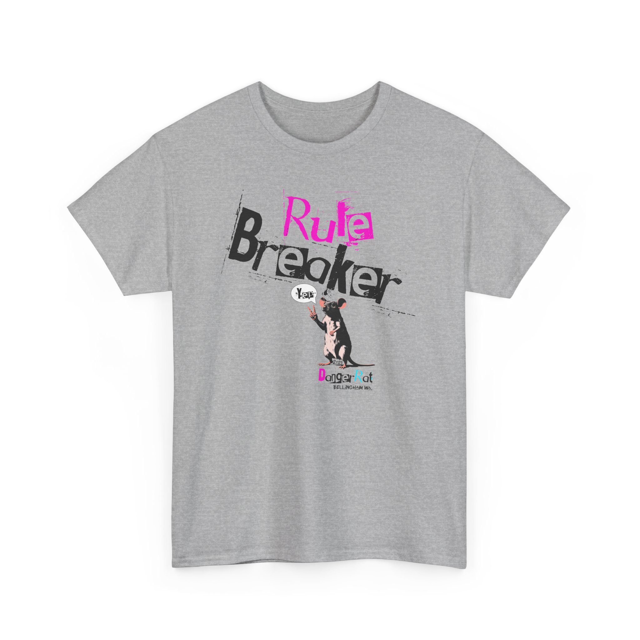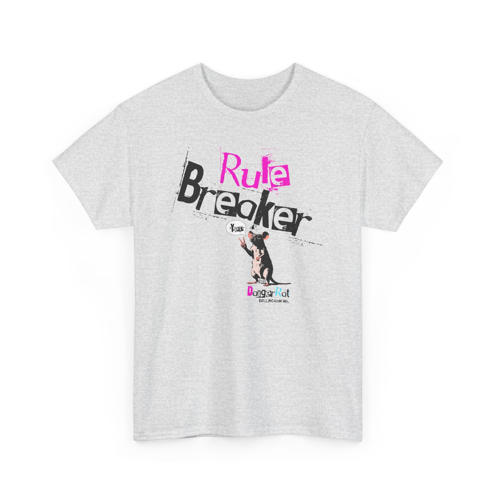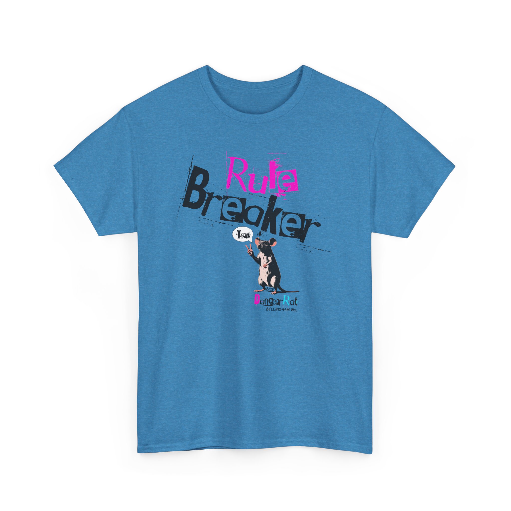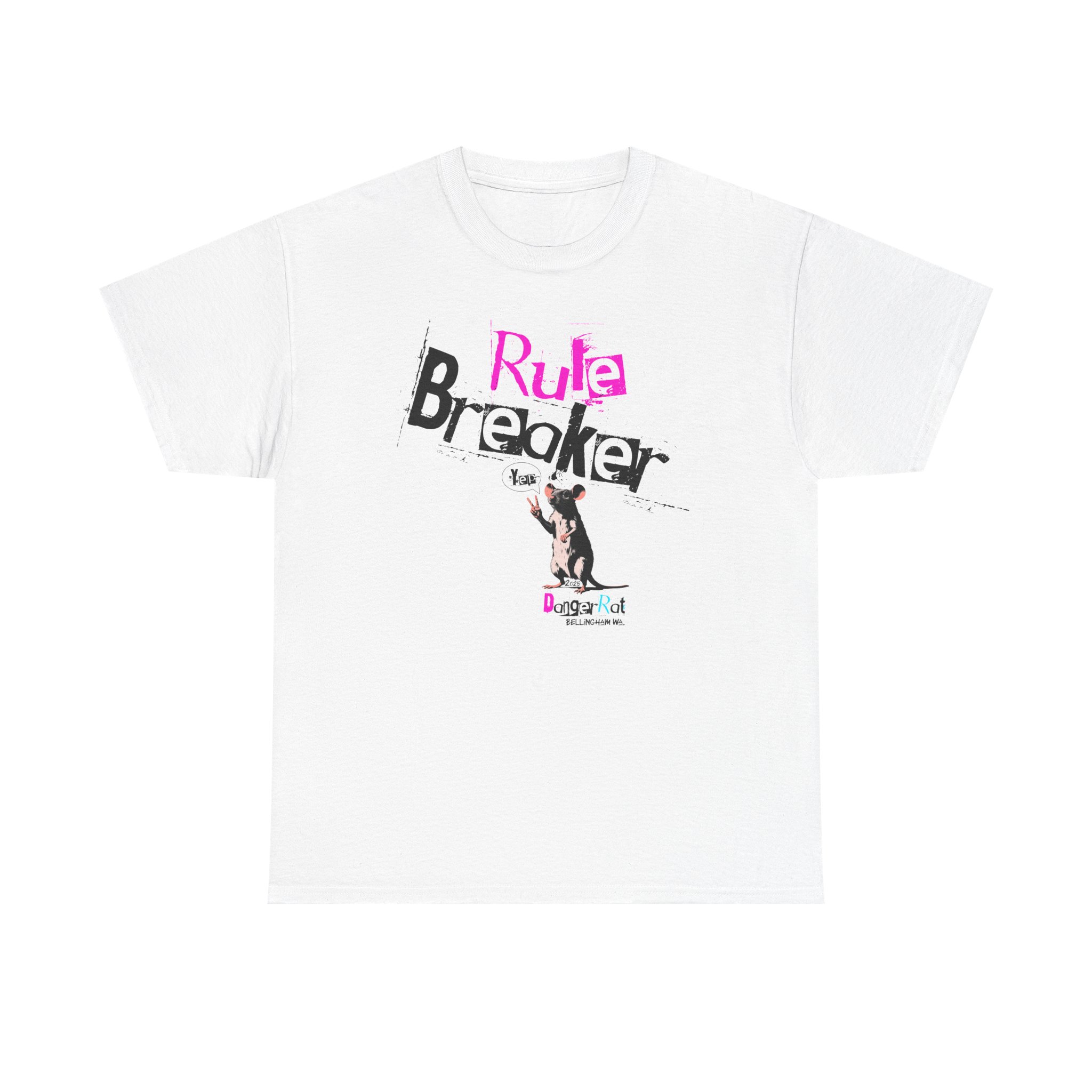 This soft, mid-weight tee carries a playful, rebellious vibe. A distressed, mixed-font front graphic reads “Rule Breaker” above a small illustrated rat—bold, a little cheeky, and unapologetic. The back features a colorful oval logo that nods to underground zines and DIY show flyers. Wear it to show a streak of humor and defiance, whether you’re wandering city alleys, stacking records at a flea market, or meeting friends at a low-key gig. The relaxed crew fit and smooth cotton surface keep the focus on the art while staying comfortable all day.
